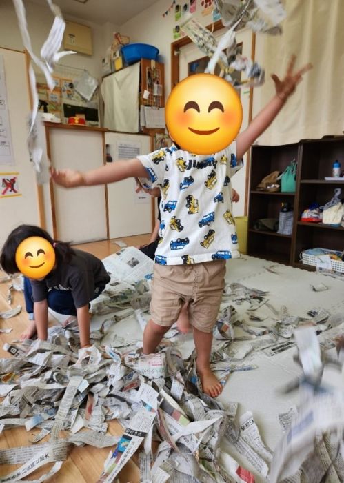 お部屋で新聞をちぎって、思いっきり投げて、浴びて、拾って、浴びて、笑顔満開です。