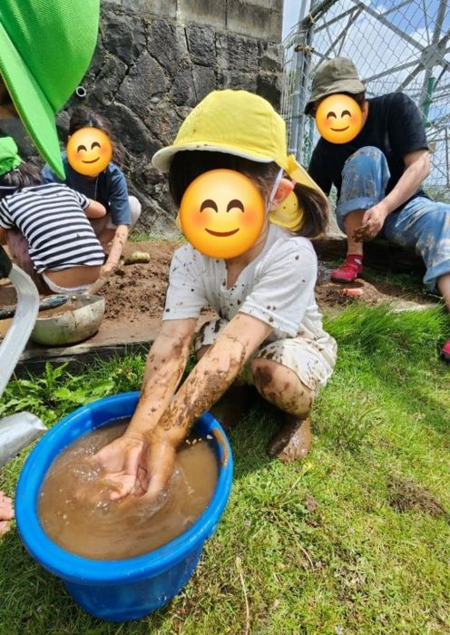 園庭では、水や泥の感触を楽しみました。