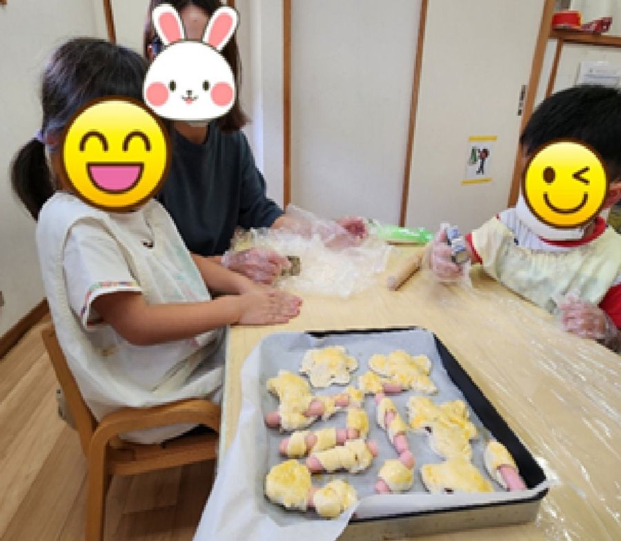 おやつ作りでは、パイ生地の型抜きをしてチョコやソーセージを包んだり、巻いたりと、苦戦しながらも美味しいパイが出来上がりました。